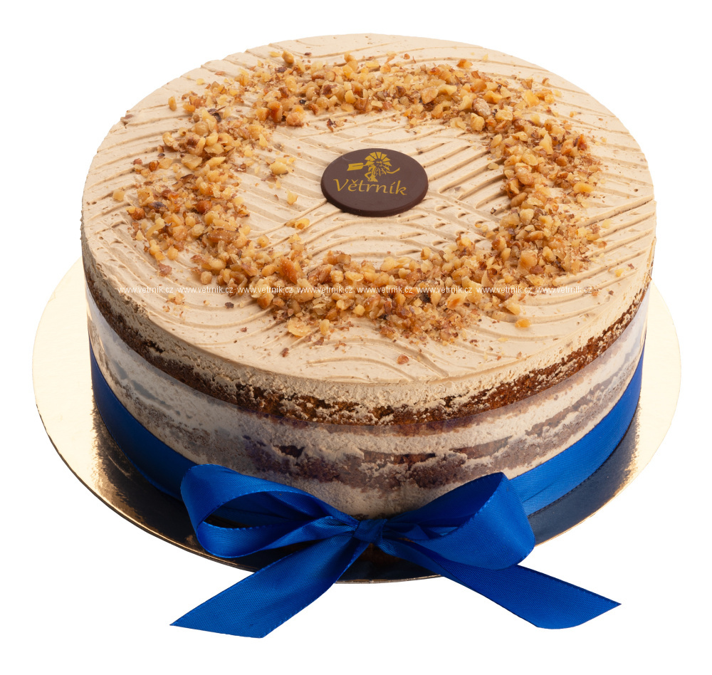 Ořechovo-kávový dort z máslového korpusu s vlašskými ořechy plněný kávovým krémem z mascarpone a šlehačky. Informace o přesném složení můžeme zaslat e-mailem.