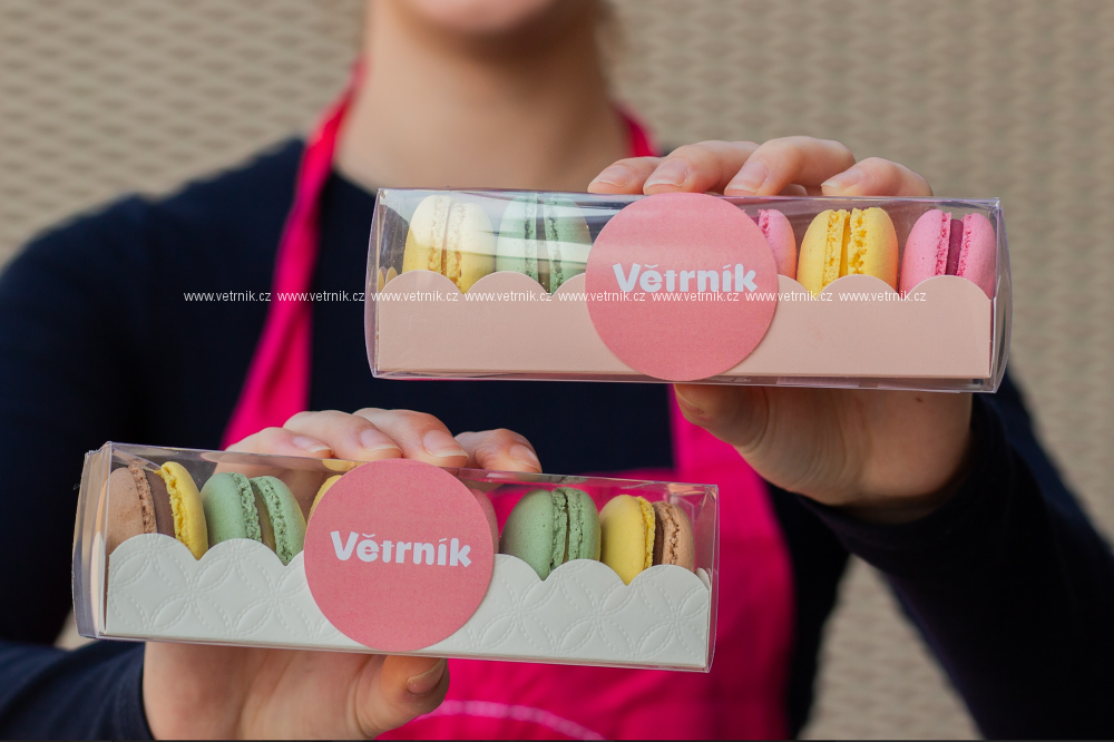 Makronky z mandlových skořápek plněné svěží chutí malin, manga s maracujou a krémovou pistácií. Krabička obsahuje 6 ks makronek, 2 ks malina, 2 ks mango-maracuja, 2 ks pistácie.