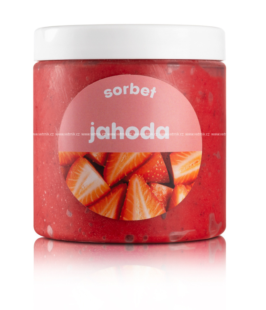 Jahodový sorbet z pravých jahod. Sorbet je vyrobený z jahod, cukru a trošku vody.